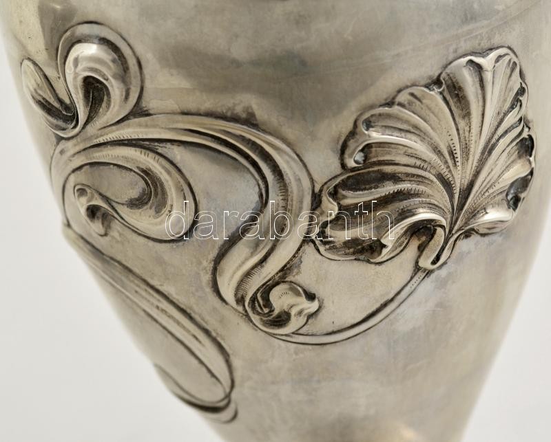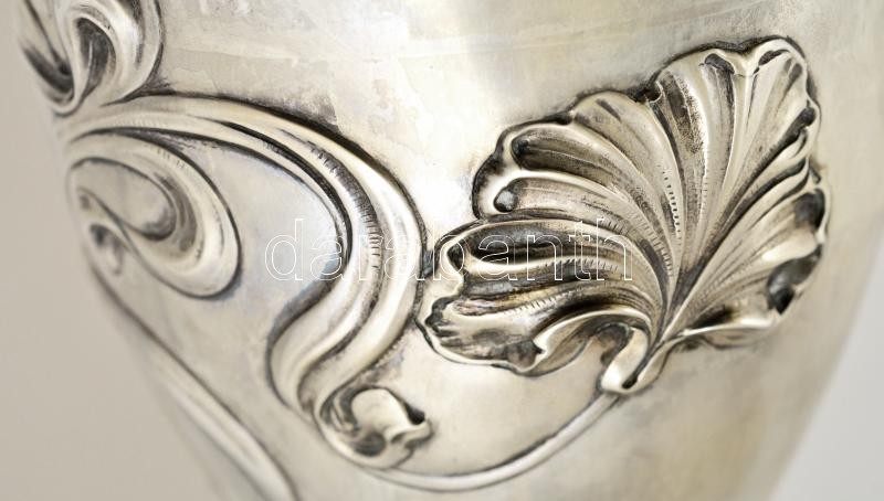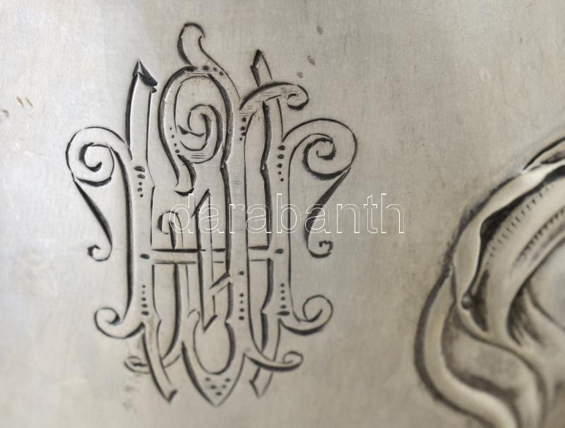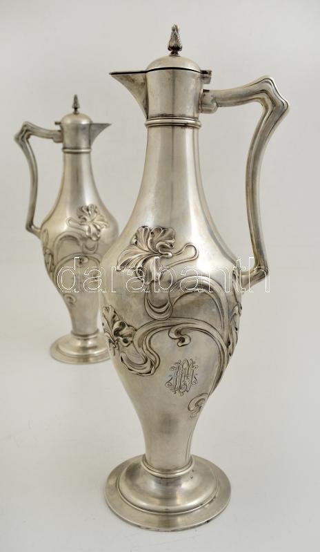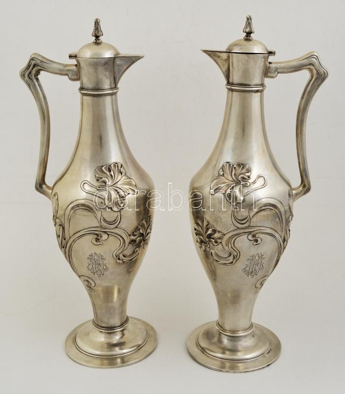 Leírás: Ezüst (Ag.) szecessziós karafa pár (2 db), jelzett, mesterjeggyel, monogrammal, m:36 cm (2×), nettó:1304 g