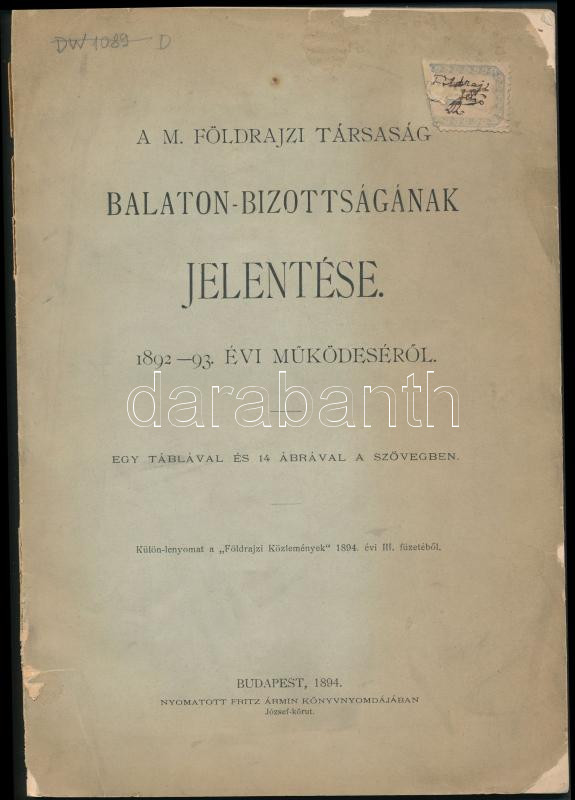 Leírás: 1894 A M.Földrajzi Társaság Balaton-Bizottságának jelentése 1892-93. évi működésről, pp.:62, 23x16cm