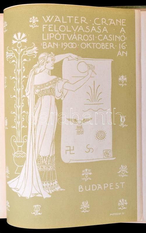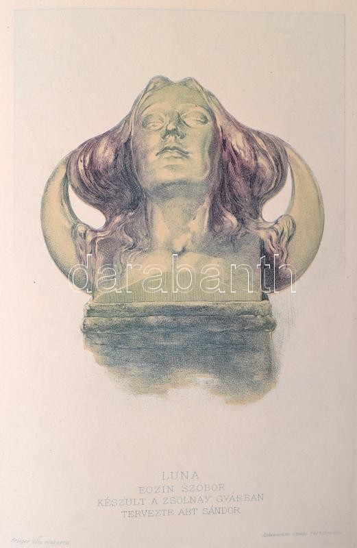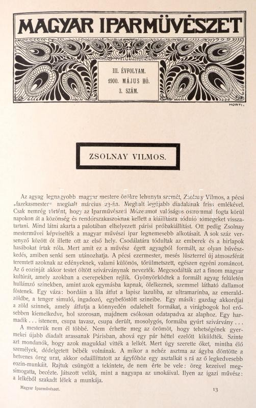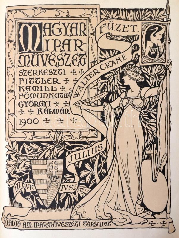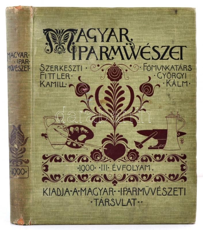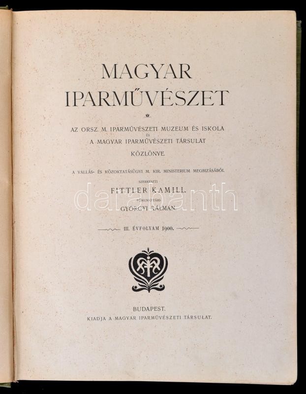 1900 Magyar Iparművészet. III. évfolyam. 1900. Szerk.: Fittler Kamil. Főmunkatárs Györgyi Kálmán. Bp., 1900, Magyar Iparművészeti Társulat, 362+2+XXXI p.+6 melléklet+Krieger Béla: Luna, eozin szobor a Zsolnay gyárban, rézkarc. Számos egészoldas, és szövegközti illusztrációval, közte számos szecesszióssal. Kiadói díszes, festett, illusztrált, zöld virágmintás egészvászon-kötés, Gottermayer-kötésben, kissé kopottas borítóval, kopottas, kissé sérült gerinccel, három az oldalakra ragasztott illusztrációt kiszedtek. (150., 187. oldalak, Walter Crane kiállítás plakátja (362+2. oldal.)) Benne számos érdekes írással, köztük az elhunyt Zsolnay Vilmosról (1828-1900), a párizsi világkiállításról, a budai palota Szent István-terméről.