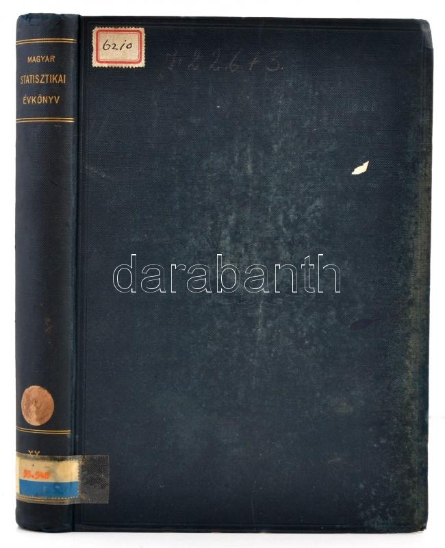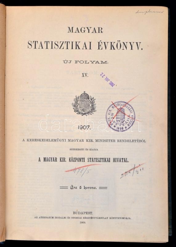 1909 Magyar Statisztikai Évkönyv. 1907. XV. évf. Szerk. és kiadja M. Kir. Központi Statisztikai Hivatal. Bp.,1909, Athenaeum. Kiadói egészvászon-kötés, foltos borítóval, volt könyvtári példány.