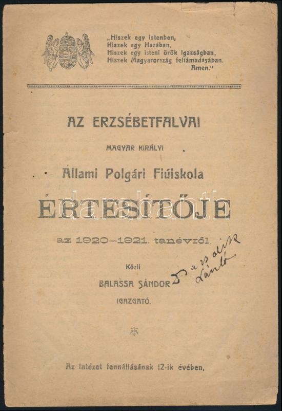 Leírás: 1920 Az Erzsébetfalvi Polgári Fiúiskola értesítője (ma: Pesterzsébet) 16 p.