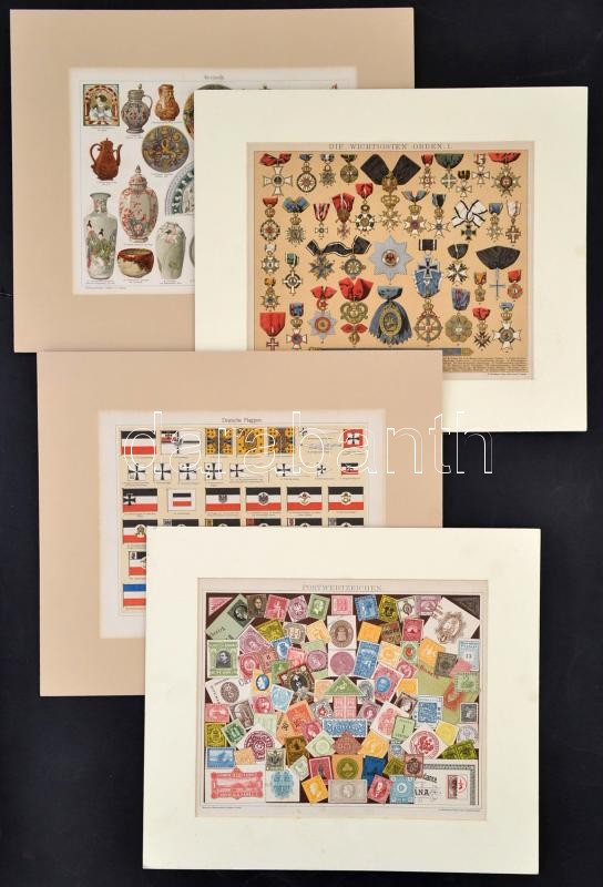 Leírás: Kerámiák, kitüntetések, zászlók, bélyegek, litho képek, német nyelven feliratozva, paszpartuban, 4 db, 23x28 cm
