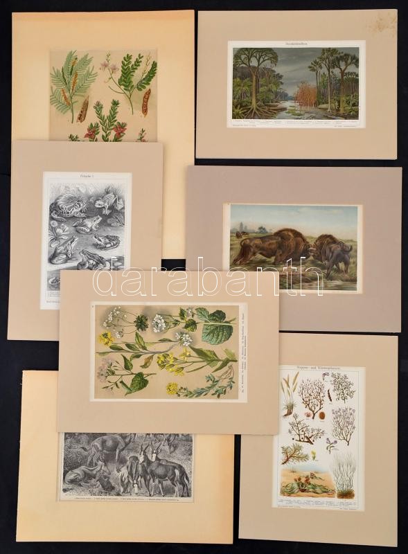 Leírás: Növények, állatok, litho és rézmetszetű képek, német nyelven feliratozva, paszpartuban, 7 db, 25x15 cm