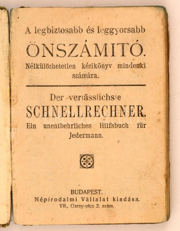 Leírás: cca 1900-1910 Bp., A legbiztosabb ás leggyorsabb önszámító. Nélkülözhetetlen kézikönyv mindenki számára, magyar és német nyelven, 112p