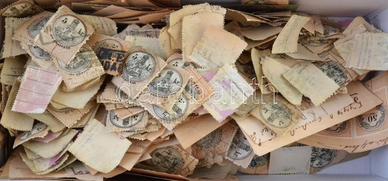 Leírás: Sok 100, akár 1-2 ezer régi okmánybélyeg áztatott és kivágott anyag, kutatáshoz cipősdobozban