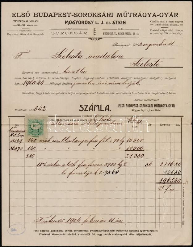 1903 Első Budapest-Soroksári Műtrágyagyár fejléces számla, okmánybélye... https://www.darabanth.com/hu/313-Gyorsarveres/313.0/Festmeny-mutargy-papirregiseg-egyeb/Okmanyok~18/1903-Elso-Budapest-Soroksari-Mutragyagyar-fejleces-szamla-okmanybelyeggel-30x23-cm~II1716623