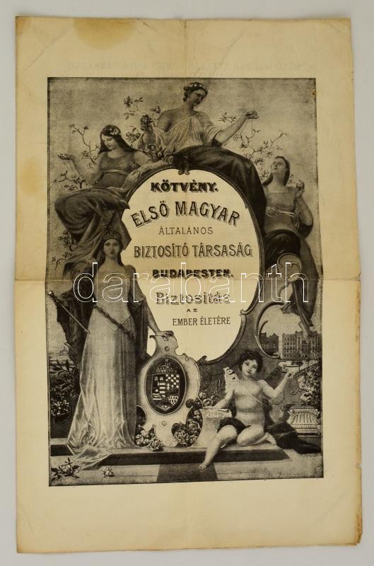 1935 Első Magyar Általános Biztosító Társaság díszes életbiztosítási kötvénye a Révai Testvérek Irodalmi Intézet Rt.-nak a Révai Nagy Lexikona vásárlói részére, hajtásnyomokkal, kissé viseltes állapotban, kis szakadással, a hátoldala foltos