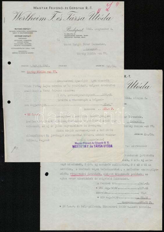 1940-1944 8 db régi fejléces számla, RAPA szabadalmazott kémény-kivakoló vállalat, Wertheim J. és Társa Magyar Felvonó- és Gépgyár Rt. (4db), Venczel Géza fűtés, Bodrik Antal üvegezés, Porta Csempéz Porta Épületburkoló és Építőanyagokat Beszerző Szövetkezet, Budapest, gyűrődésekkel.