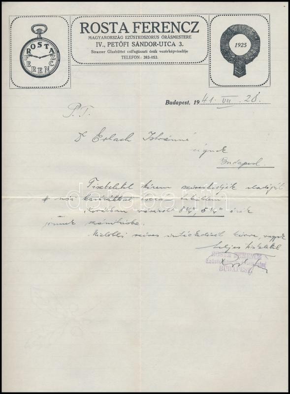Leírás: 1941 Rosta Ferencz Magyarország ezüstkoszorús óramestere, díszes fejléces levél, 29,5x22,5 cm