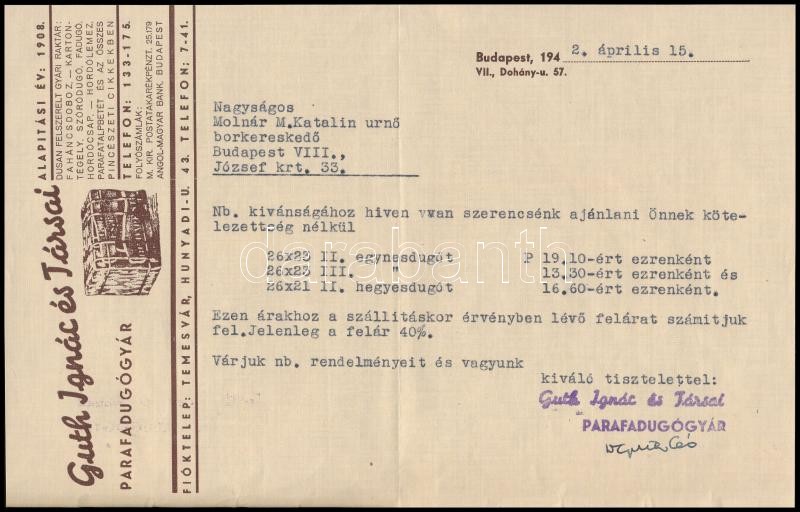 1942 Guth Ignác és Társai Parafadugógyár díszes fejléces árajánlat, 14... https://www.darabanth.com/hu/313-Gyorsarveres/313.0/Festmeny-mutargy-papirregiseg-egyeb/Okmanyok~18/1942-Guth-Ignac-es-Tarsai-Parafadugogyar-diszes-fejleces-arajanlat-14-5x22-5-cm~II1716653