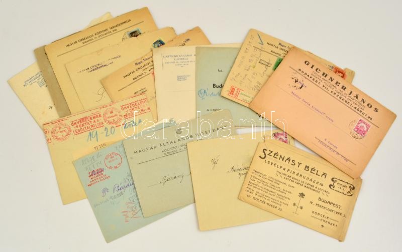 Leírás: Régi fejléces céges borítékok (Szénásy Béla, Légoltalmi Liga, Magyar Általános Hitelbank, Gichner János, stb.), 15 db