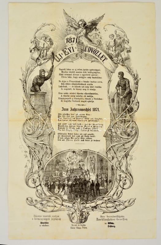 Leírás: 1871 A budai kéményyseprő legények Újévi üdvözlete. Verses köszöntő nagyméretű nyomaton magyar és német nyelven. Fametszet. 26x42 cm