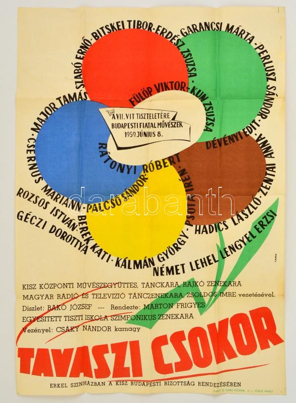 1959 "Tavaszi csokor" az Erkel Színházban a KISZ Budapesti B... https://www.darabanth.com/hu/313-Gyorsarveres/313.0/Festmeny-mutargy-papirregiseg-egyeb/Plakat~30/1959-Tavaszi-csokor-az-Erkel-Szinhazban-a-KISZ-Budapesti-Bizottsaga-rendezeseben-Plakat-es~II1717739