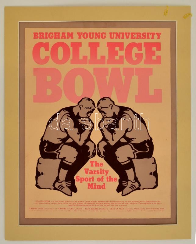 Brigham Young Univeristy College Bowl, plakát, paszpartuban, 53,5×43 c... https://www.darabanth.com/hu/313-Gyorsarveres/313.0/Festmeny-mutargy-papirregiseg-egyeb/Plakat~30/Brigham-Young-Univeristy-College-Bowl-plakat-paszpartuban-53-5C39743-cm~II1695211