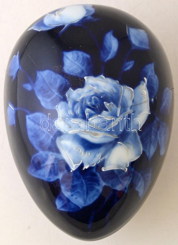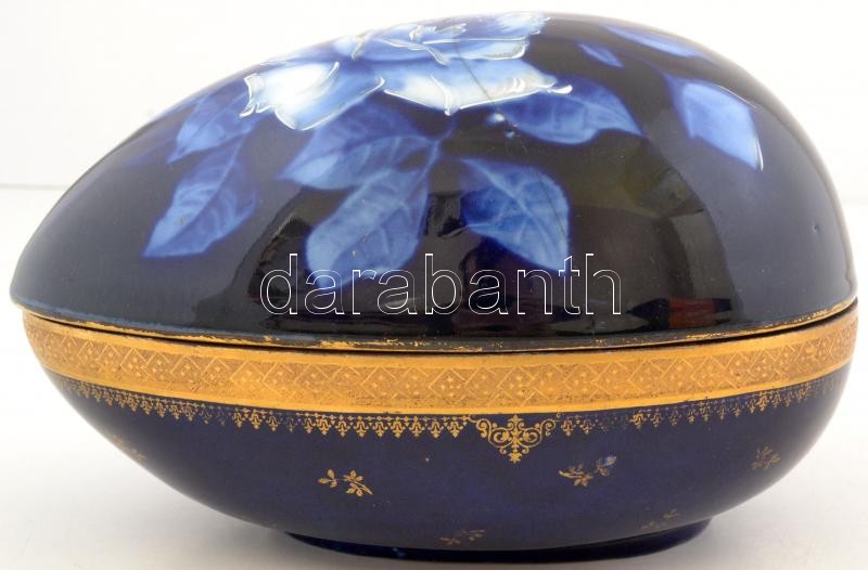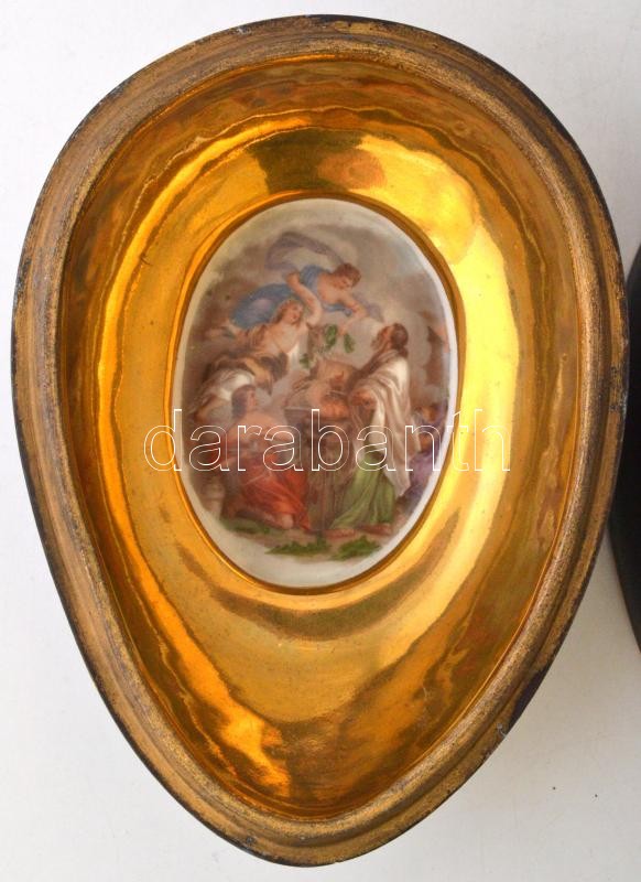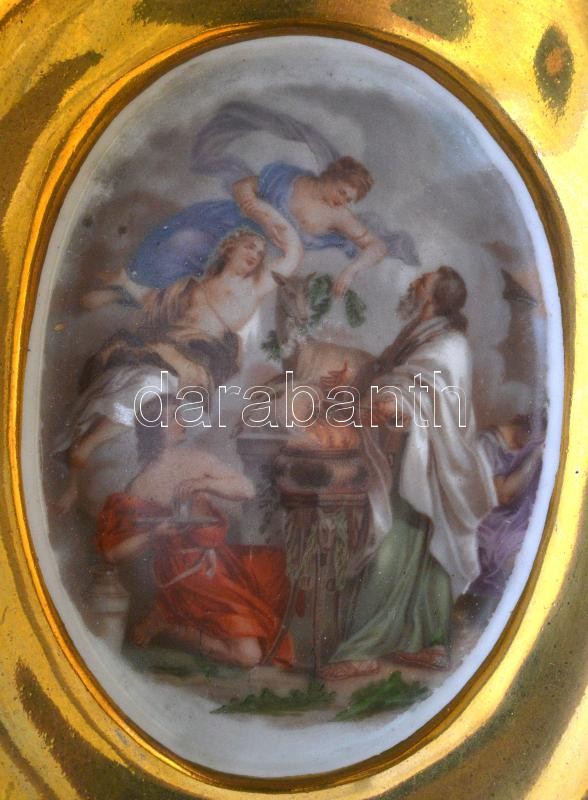 Jelzett antik nagyméretű tojás, részben kézzel festett, belsejében matricás Angelika Kauffann féle mitológiai jelenettel, hajszálrepedéssel (ragasztott), h:21 cm, m:15 cm
