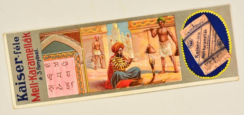 Kaiser-féle Mell-Karamellák reklám könyvjelző, litográfia, 15x5 cm https://www.darabanth.com/hu/313-Gyorsarveres/313.0/Festmeny-mutargy-papirregiseg-egyeb/Reklam~22/Kaiser-fele-Mell-Karamellak-reklam-konyvjelzo-litografia-15x5-cm~II1712658