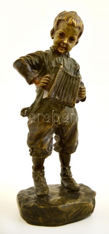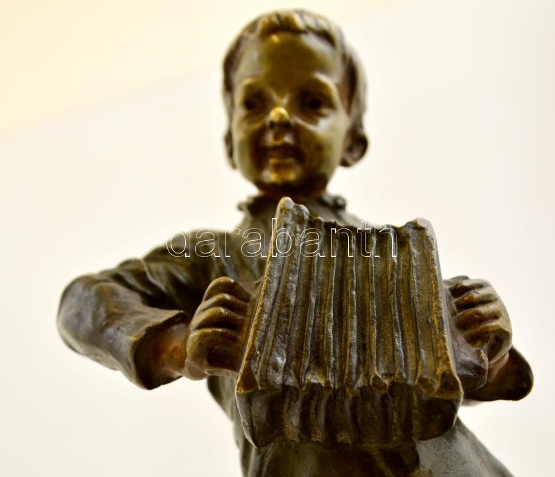Jose Cardona (1878-1923): Harmonikás fiú. Bronz szobor. Jelzett (LV Bronze Garanti), m:30 cm / Jose Cardona (1878-1923): Boy with accordion. Bronze statue. Signed. 30 cm