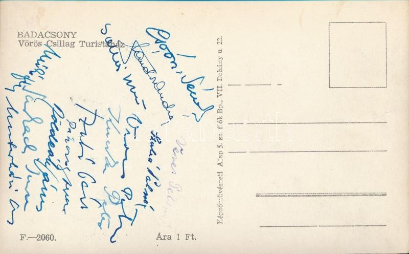 cca 1965 Csoóri Sándor (1930-2016), Veres Péter (1897-1970), Szabó Pál (1893-1970), Földeák János (1910-1997), Sarkady Imre (1921-1961), Kuczka Péter (1921-1999) és mások által aláírt, de el nem küldött képeslap, 9x14 cm.
