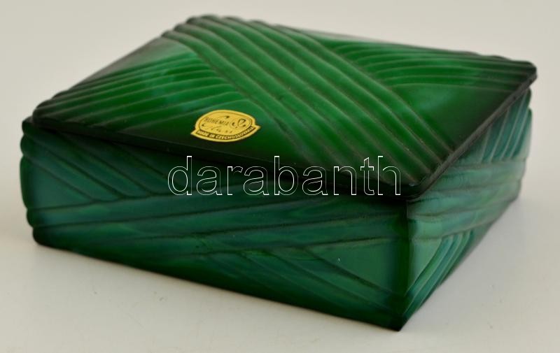 Leírás: Bohemia Glass dobozka, formába préselt malachit üveg, jelzett, apró karcolásokkal, 11×9,5 cm