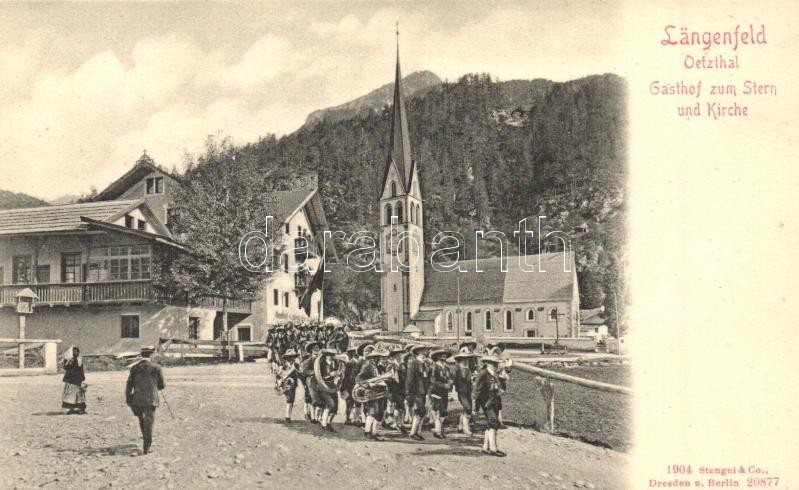 Leírás: Längenfeld, Oetzthal (Tirol); Gasthof zum Sternd und Kirche / guest house, Tyrolean music band