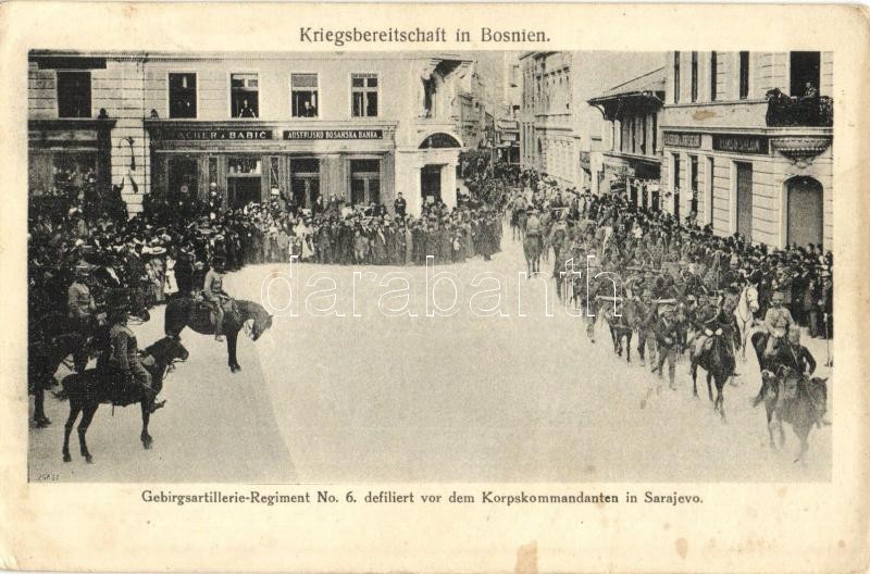 Sarajevo, Kriegsbereitschaft, Gebirgsartillerie Regiment No. 6. defiliert vor dem Korpskommandanten / Mountain Artillery Regiment no. 6. parading in front of the corps commander (EK)