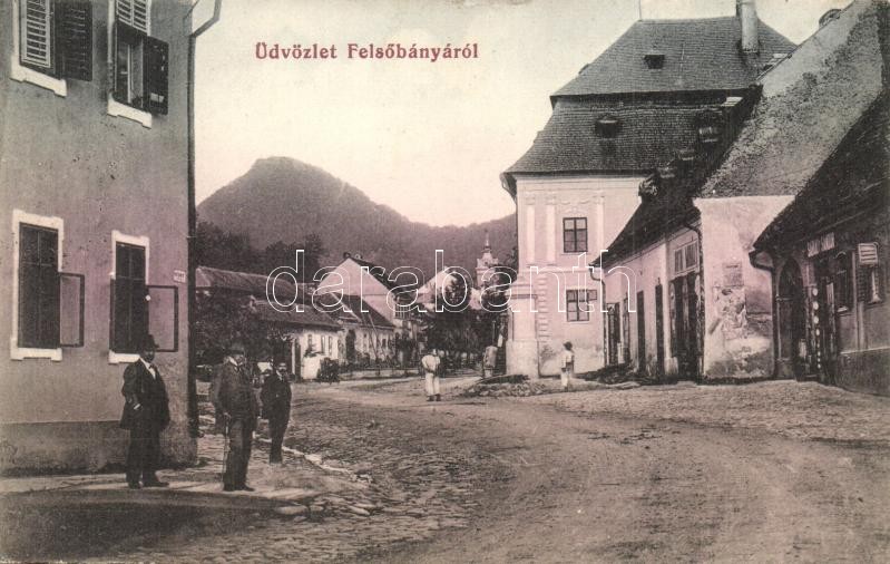 Leírás: Felsőbánya, Baia Sprie; utcakép, Sárody Sándor és Róth Mihály üzlete / street view with shops