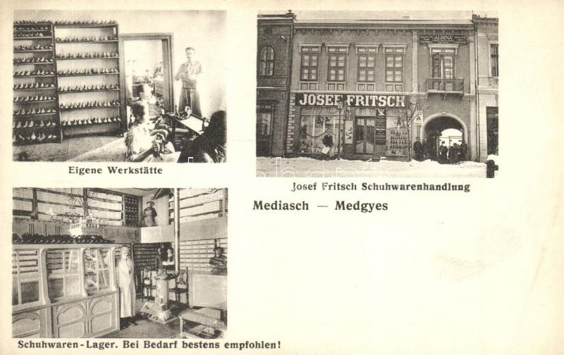 Medgyes, Mediasch, Medias; Eigene Werkstätte, Josef Fritsch Schuhwarenhandlung, Schuhwaren-Lager / Josef Fritsch cipő üzlete, műhely és raktár belső / shoe shop, workshop and storage interior (EK)