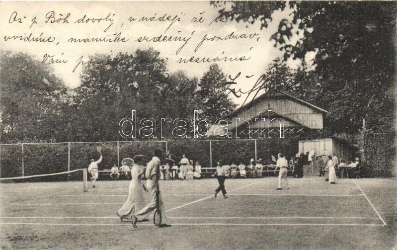 Leírás: Rimaszombat, Rimavska Sobota; Teniszpálya teniszezőkkel. Ifj. Rábely Miklós kiadása / tennis court with tennis players (EK)
