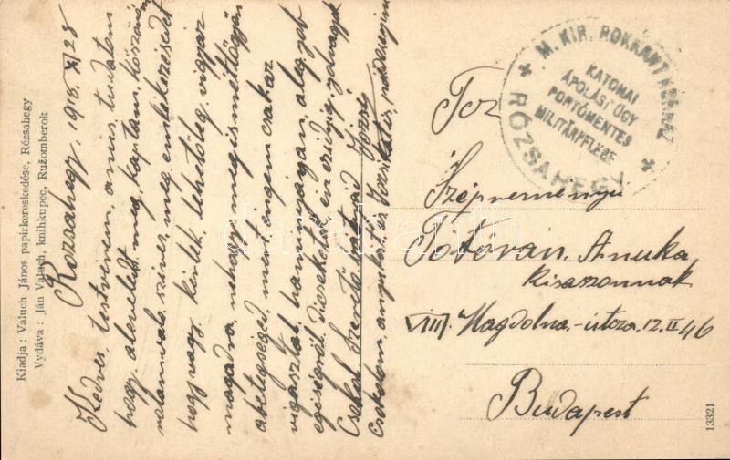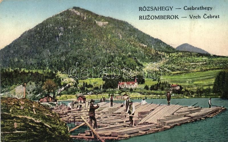 Rózsahegy, Ruzomberok; Csebrat-hegy, tutajosok faúsztatáskor. Kiadja Valuch János / mountain, timber transport by rafters + "M. Kir. Rokkant kórház katonai ápolási ügy portómentes"