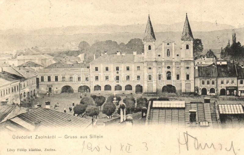 Leírás: Zsolna, Sillein, Zilina; Fő tér, Szent Pál templom, szálloda, üzletek. Lövy Fülöp kiadása / main square, church, hotel, shops (EK)