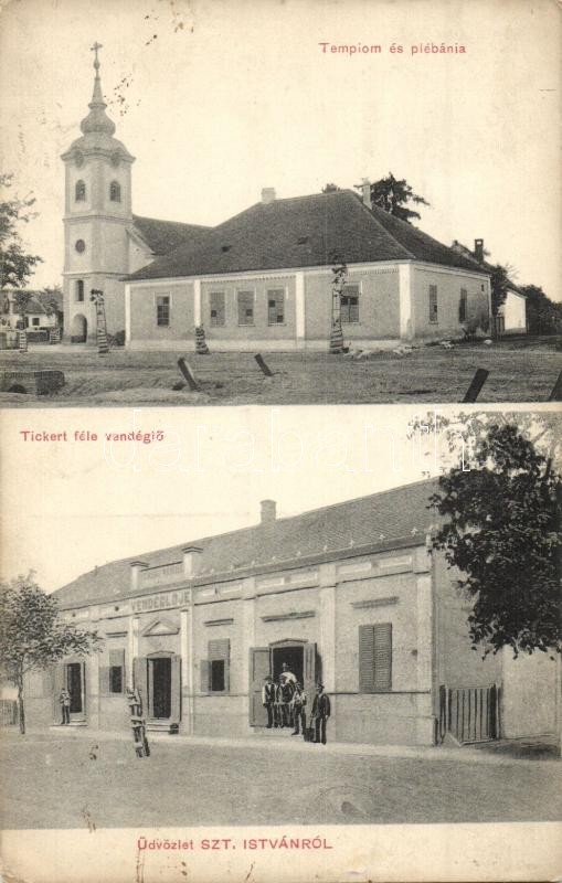 Leírás: Baranyaszentistván, Petlovac; Templom és plébánia, Tickert Wendel vendéglője és saját kiadása / church and parish, publisher's restaurant (EK)