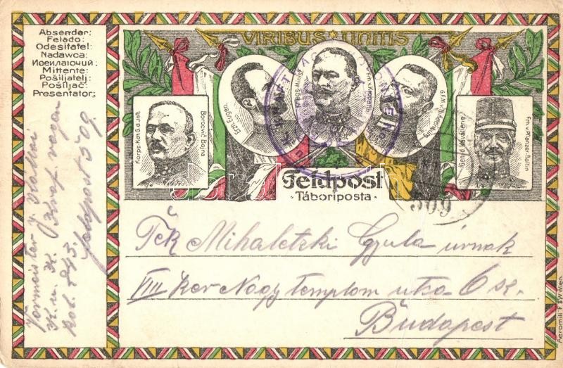 1916 Tábori Posta a Központi hatalmak katonai vezéreivel; Borocvic Bonja, Erzherzog Eugen, Alexander von Krobatin, Hindenburg, Pflanzer-Baltin / WWI K.u.K. Feldpost with Central Powers military leaders. Viribus Unitis (EK)
