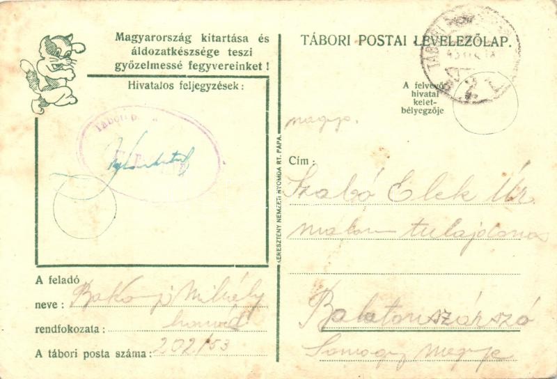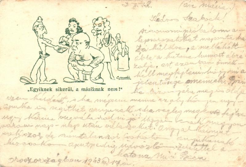 Leírás: 1943 Egyiknek sikerül, a másiknak nem! Tábori Postai Levezőlap / WWII Hungarian military humour s: Csordás (EK)