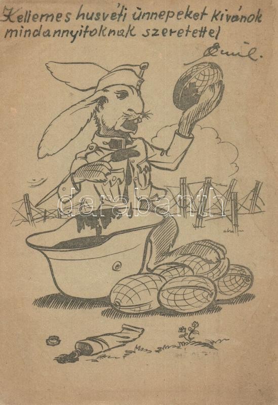 Leírás: 1943 Kellemes Húsvéti Ünnepeket! Tábori Postai Levezőlap / WWII Hungarian military Easter greeting card, rabbit soldier (EK)