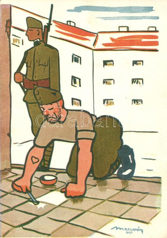 Leírás: II. világháborús, humoros magyar katonai lap; kiadja Bruck Mihály / WWII Hungarian military art postcard s: Magyarász