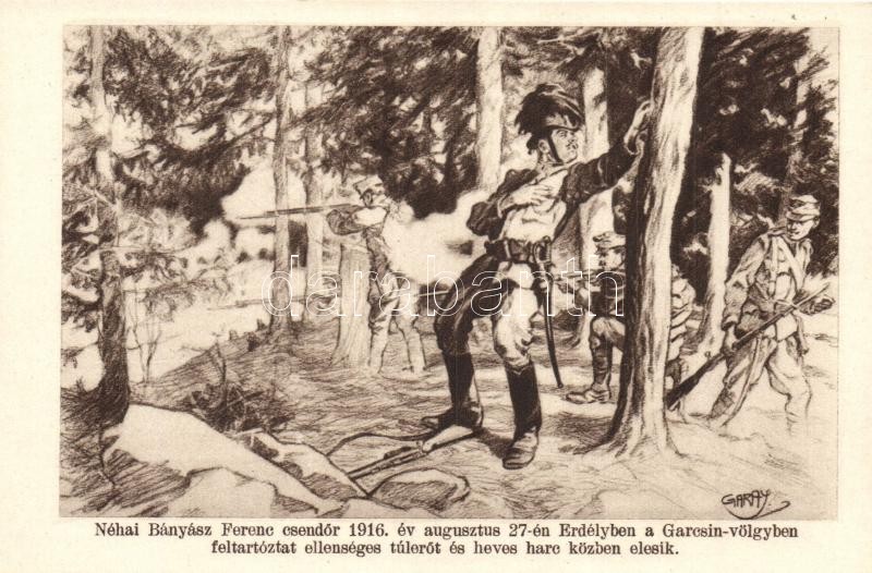 Néhai Bányász Ferenc csendőr 1916. év augusztus 27-én Erdélyben a Garcsin-völgyben feltartóztat ellenséges túlerőt és heves harc közben elesik. Kiadja a Csendőrségi emlék-alap / WWI Hungarian gendarmerie s: Garay