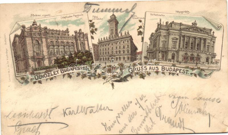 Leírás: 1895 (Vorläufer!!!) Budapest, Fővárosi vigadó, Régi városház, Népszínház. Leitner M. és fia floral Art Nouveau litho (Rb)