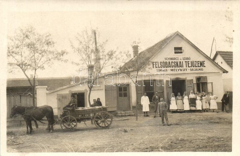 Leírás: 1934 Mélykút, Schwarcz és Szabó Felsőbácskai tejüzem üzlete Mélykúton, tejes szekér. photo