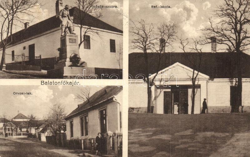 Leírás: Balatonfőkajár, Hősök szobra, Református iskola, Orvosi lak. Hangya kiadása