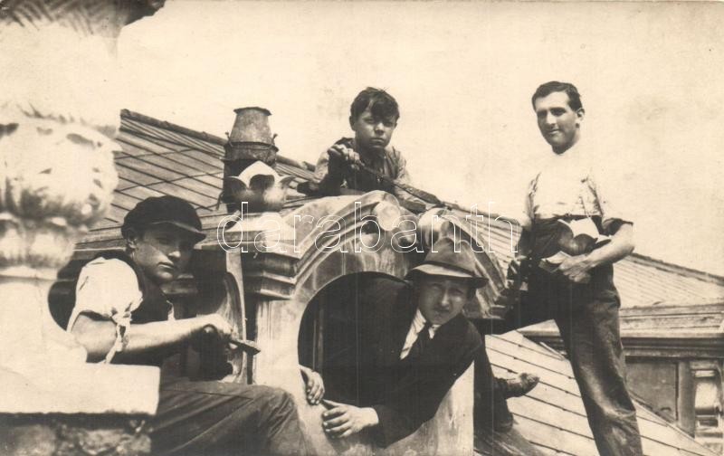 Leírás: Balatonkenese, épület tetején dolgozó bádogosok. Battonyánc János photo