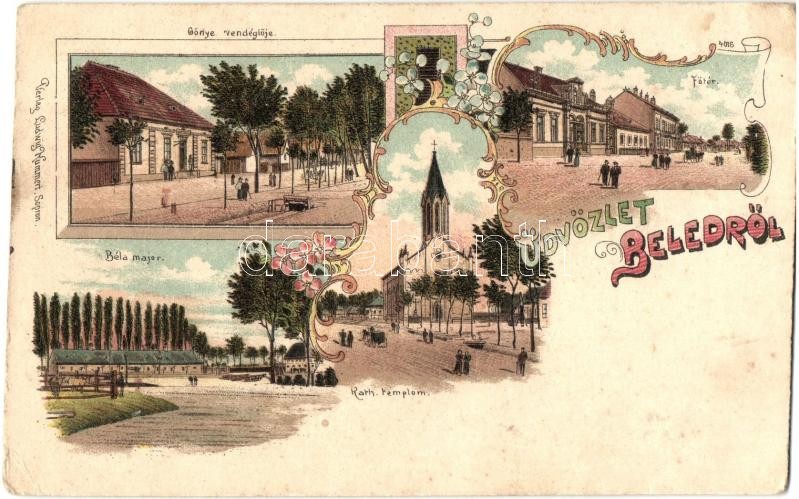 Leírás: Beled, Gönye vendéglője, Béla major, Fő tér, Katolikus templom. Verlag Lugwig Kummert floral Art Nouveau litho (EK)