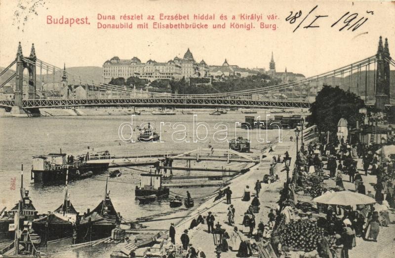 Budapest, Duna részlet, Erzsébet híd és a Királyi vár, rakpart, piac, ... https://www.darabanth.com/hu/313-Gyorsarveres/313.0/Kepeslapok/Magyarorszag~500006/Budapest-Duna-reszlet-Erzsebet-hid-es-a-Kiralyi-var-rakpart-piac-gozhajok-Taussig-A-k~II1712919