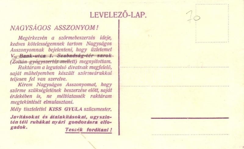 Leírás: Budapest VI. Ó utca 17. Kiss Gyula szűcs mester üzlete, reklámlap (r)