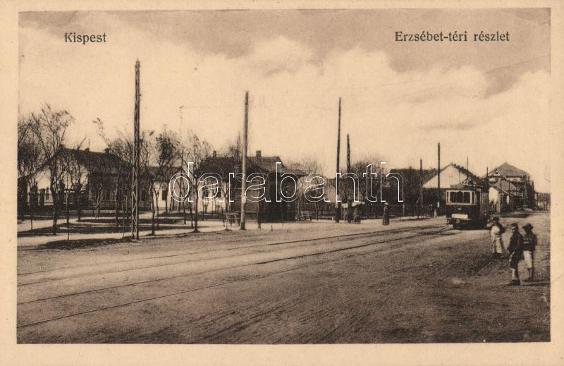 Leírás: Budapest XIX. Kispest, Erzsébet tér, villamos, kiadja 'Hungária'