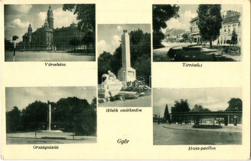 Győr, városháza, Hősök emlékműve, Ibusz pavilon, országzászló https://www.darabanth.com/hu/313-Gyorsarveres/313.0/Kepeslapok/Magyarorszag~500006/Gyor-varoshaza-Hosok-emlekmuve-Ibusz-pavilon-orszagzaszlo~II1660801