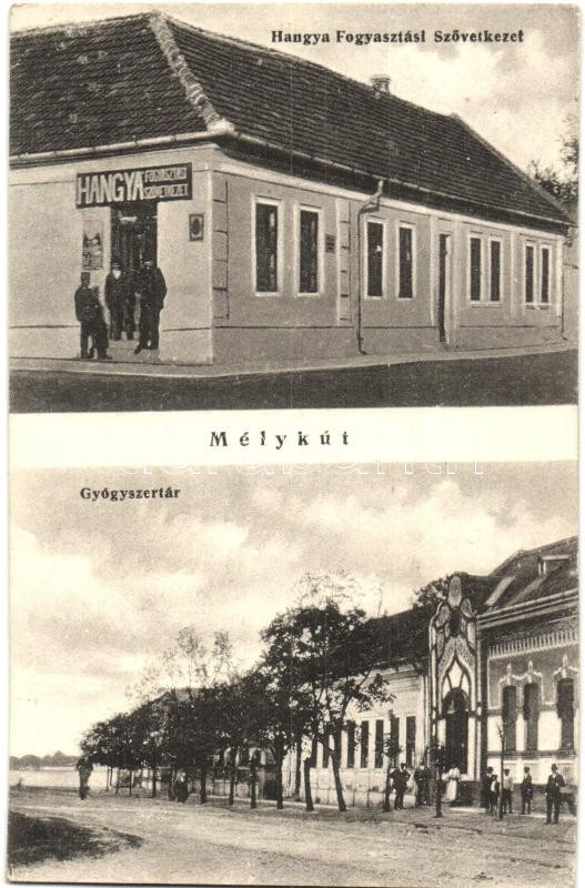 Leírás: Mélykút, Hangya fogyasztási szövetkezet üzlete, gyógyszertár. Barth Gyula kiadása (EK)