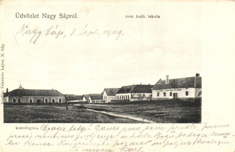 Leírás: Nagysáp, Római katolikus iskola, Községháza. Eckstein Lajos kiadása (EK)