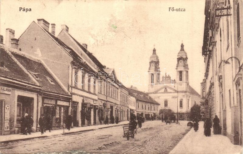 Pápa, Fő utca, üzletek, templom (EK)