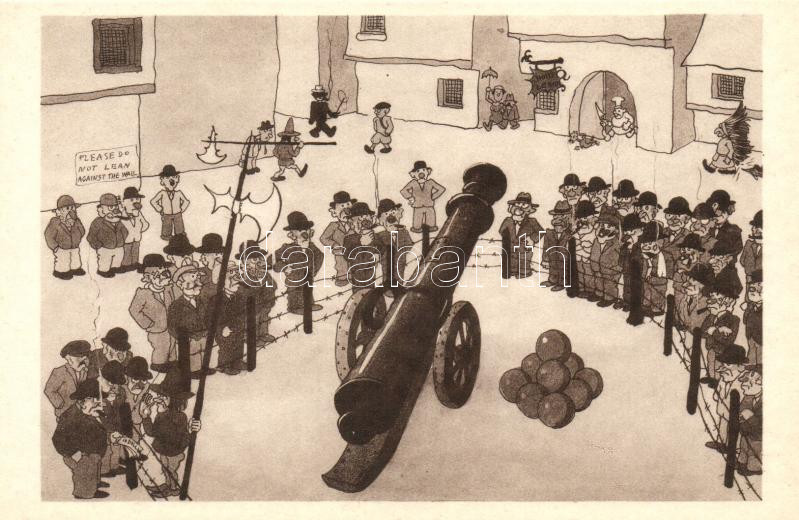 Leírás: 1933 Chicago World's Fair art postcard, They admire the old gun; Messrs Wellens & Godenne s: Jean Dratz