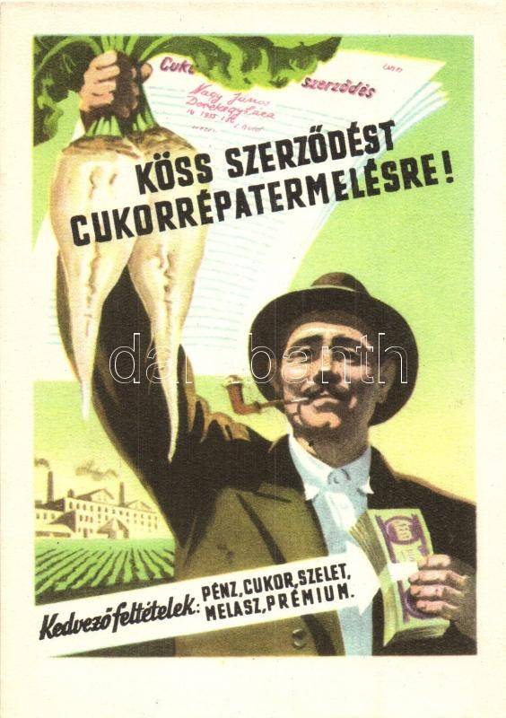 Leírás: 1955 Köss szerződést cukorrépa termelésre! Mezőgazdasági Kiállítás / Hungarian socialist propaganda, sugar beet production advertisement card (EK)